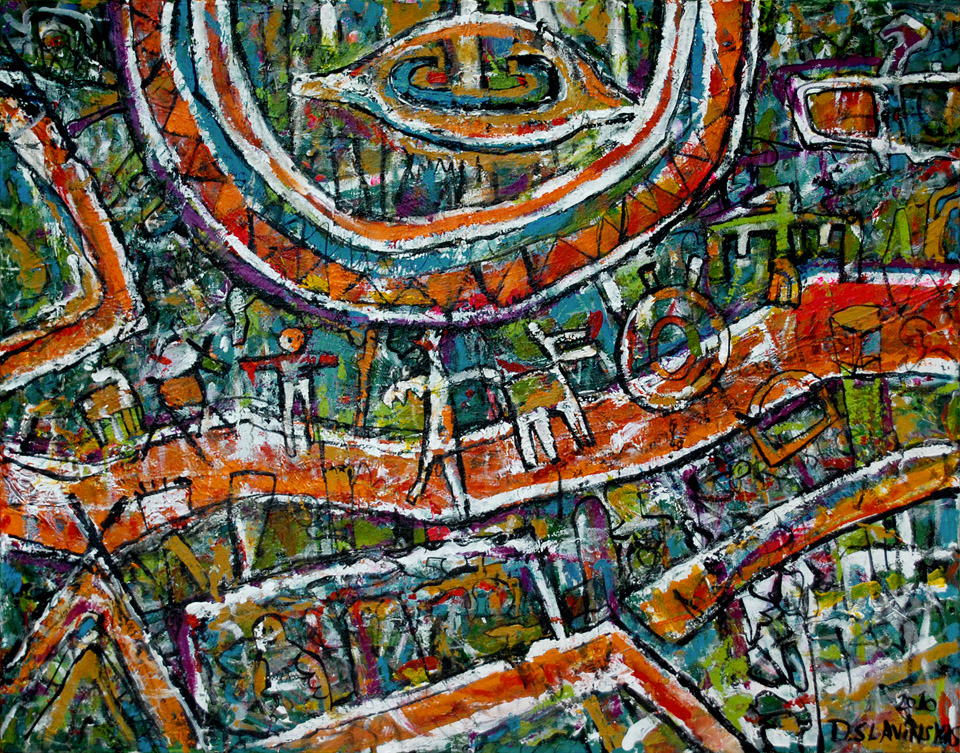In this painting I aimed to explore the border between conscious and unconscious, material and eternal – the door which leads from one to another. I took Native Americans’s afterlife concept as a starting point – they believed that after death spirit goes to Eternal Hunting Ground (or Happy Hunting Ground) which resembles the living world but is immaterial (“the Milky Way is the path to it”).